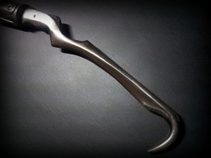 ブレード接続点から10mm~15mm下部に「人差し指の第2関節」が位置する握り方が良いと思います。(この位置らだとちょうどトリガー部に指先が掛かる設計)一般形状ハッカーに慣れている場合、ブレード接続点付近を握ってしまう傾向にあります。この場合、フィンガートリガー突出部に指があたり回転時に違和感があります。フィンガートリガーの意味として回転を制御し止める機能としてある為、ある程度の突出を持たせています。荒鉄ハッカーの機能を十二分に発揮する為、一度握り位置の調節をお願いいたします。